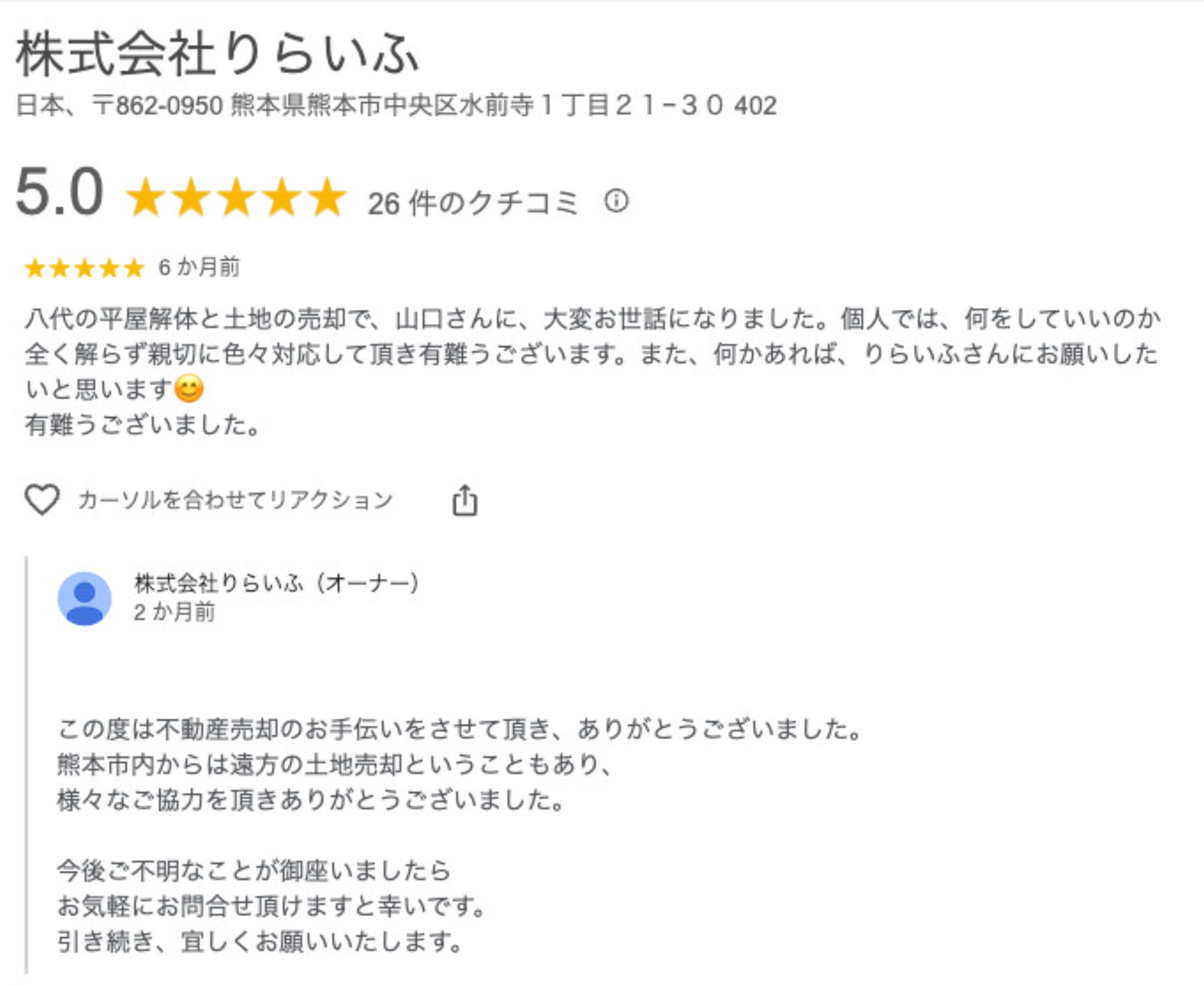 - 八代の平屋解体と土地の売却で、山口さんに、大変お世話になりました。個人では、何をしていいのか全く解らず親切に色々対応して頂き有難うございます。また、何かあれば、りらいふさんにお願いしたいと思います😊 有難うございました。