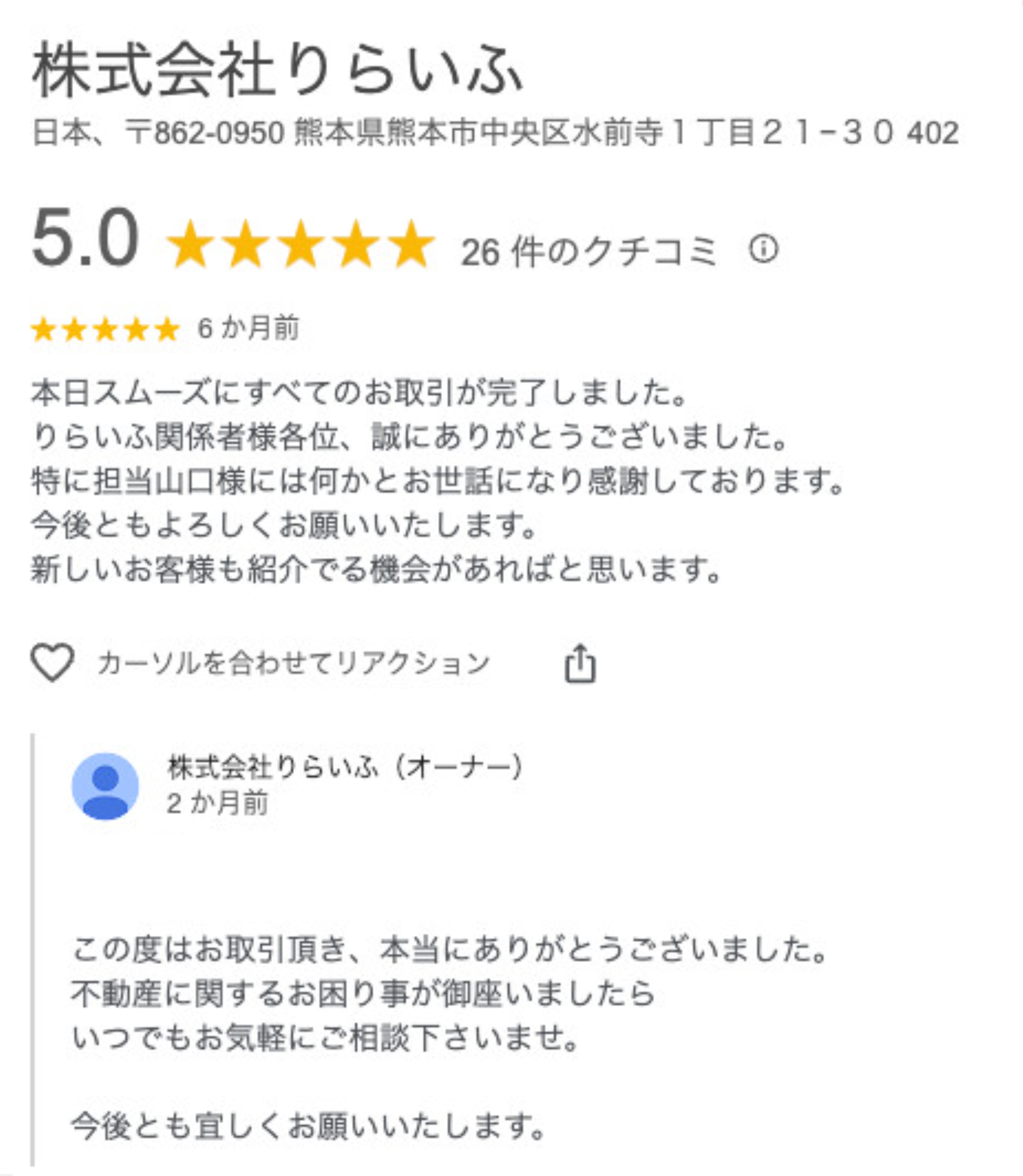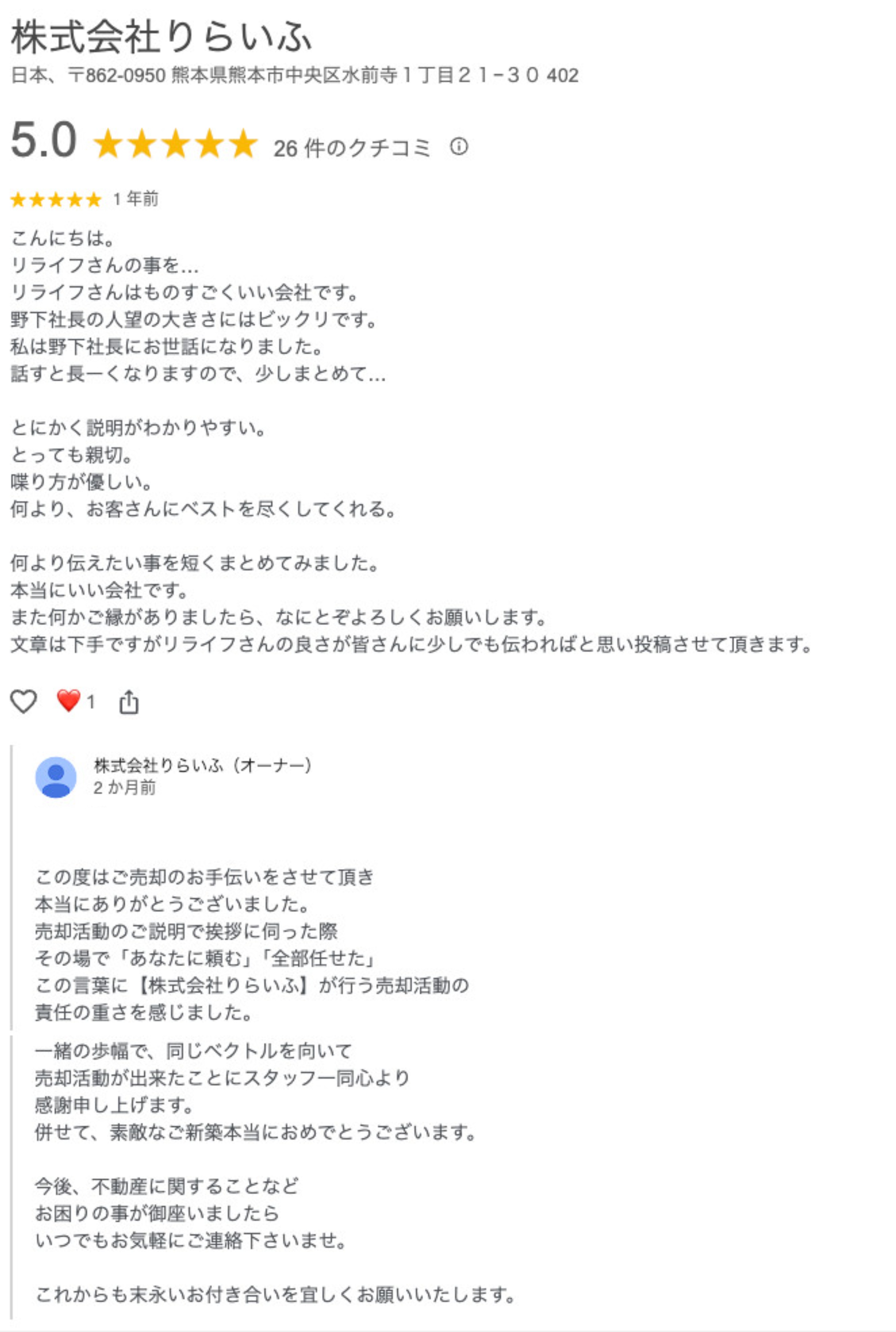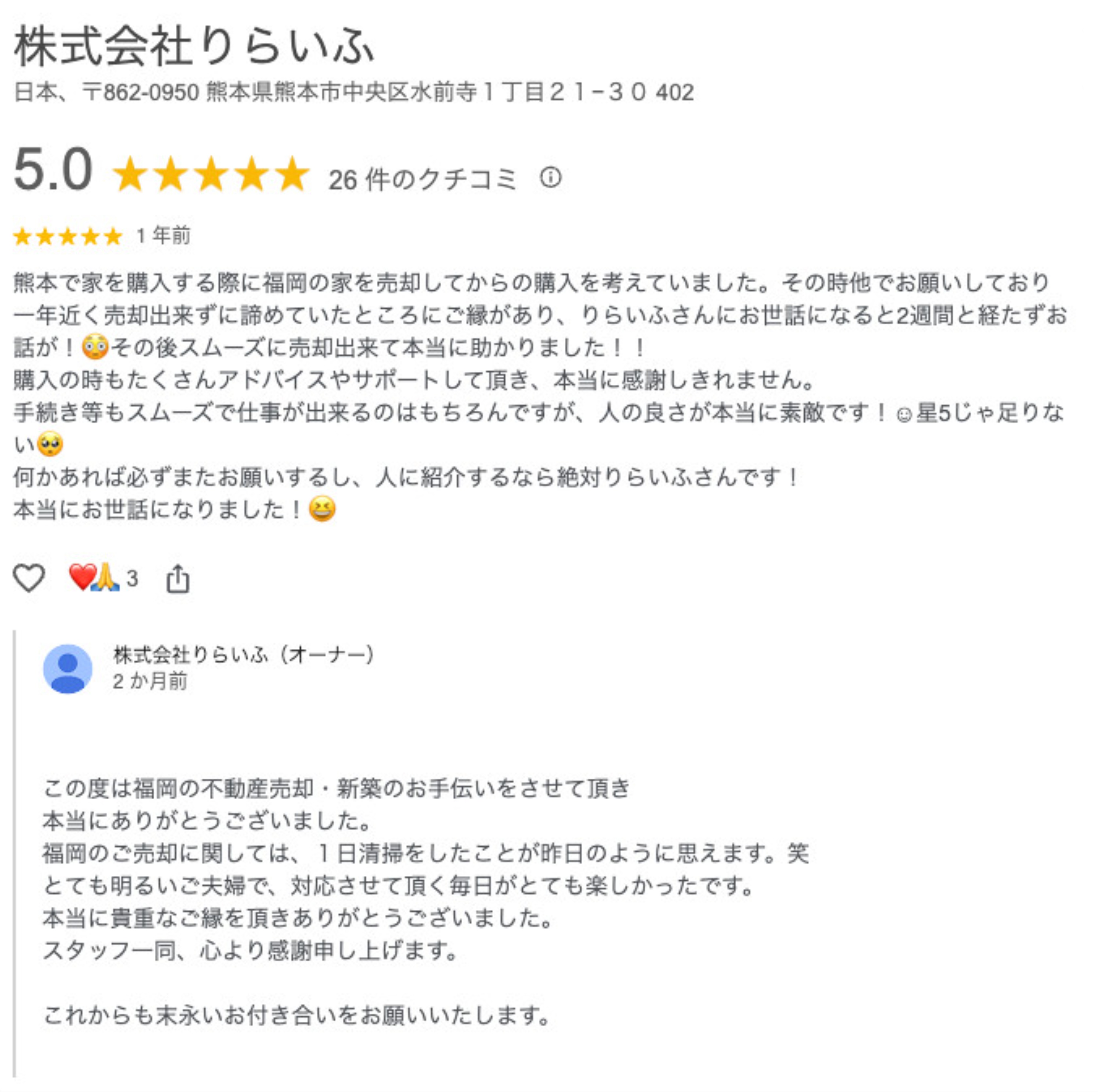 - 熊本で家を購入する際に福岡の家を売却してからの購入を考えていました。その時他でお願いしており一年近く売却出来ずに諦めていたところにご縁があり、りらいふさんにお世話になると2週間と経たずお話が!😳その後スムーズに売却出来て本当に助かりました!!